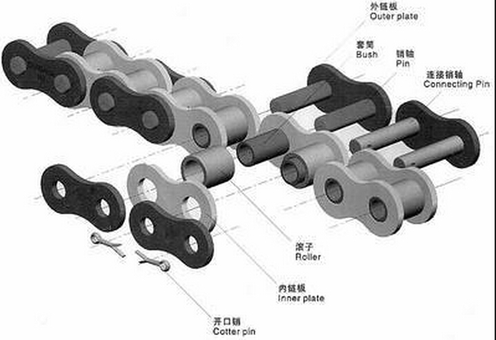 由鏈板、鏈銷(xiāo)、軸套等部件組成;同一品種的鏈條按節(jié)距、排數(shù)、鏈條寬度以及極限拉伸載荷的不同劃分規(guī)格。