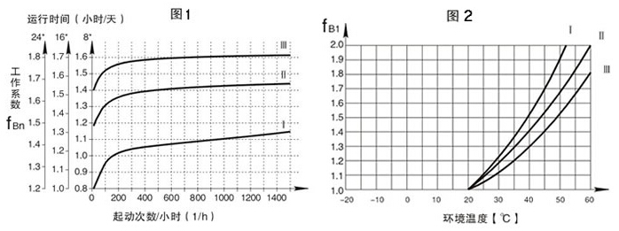 S系列選型:總工作系數(shù)f∑取決于每天工作時間,每小時起動次數(shù)的工作系數(shù)fBn(圖1)和環(huán)境溫度變化的工作系數(shù)fB1(圖2),其關(guān)系為f∑ =fBn × fB1使選型表中的使用系數(shù)fB>f∑。